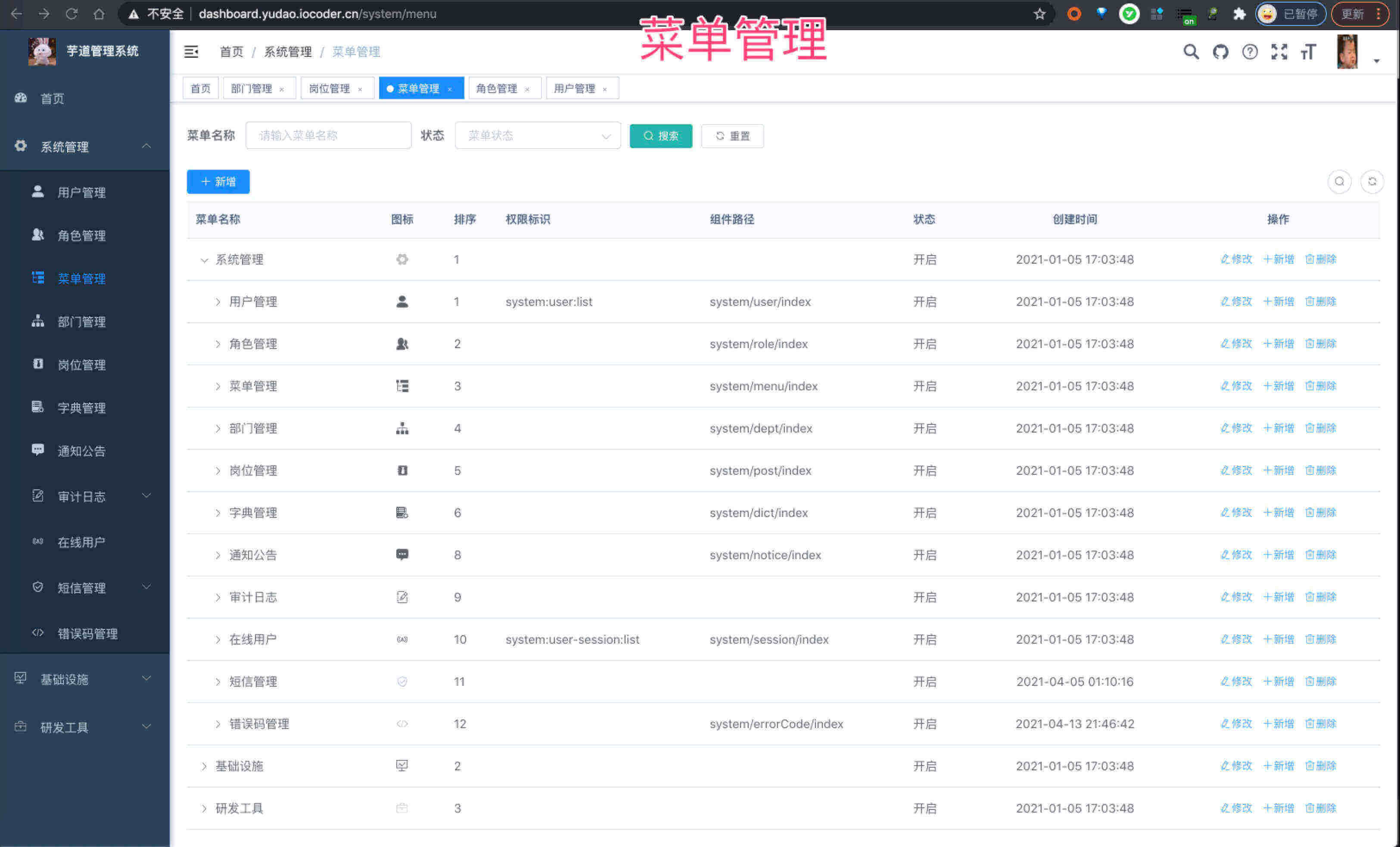 | 菜单管理 | 配置系统菜单、操作权限、按钮权限标识等,本地缓存提供性能 | |