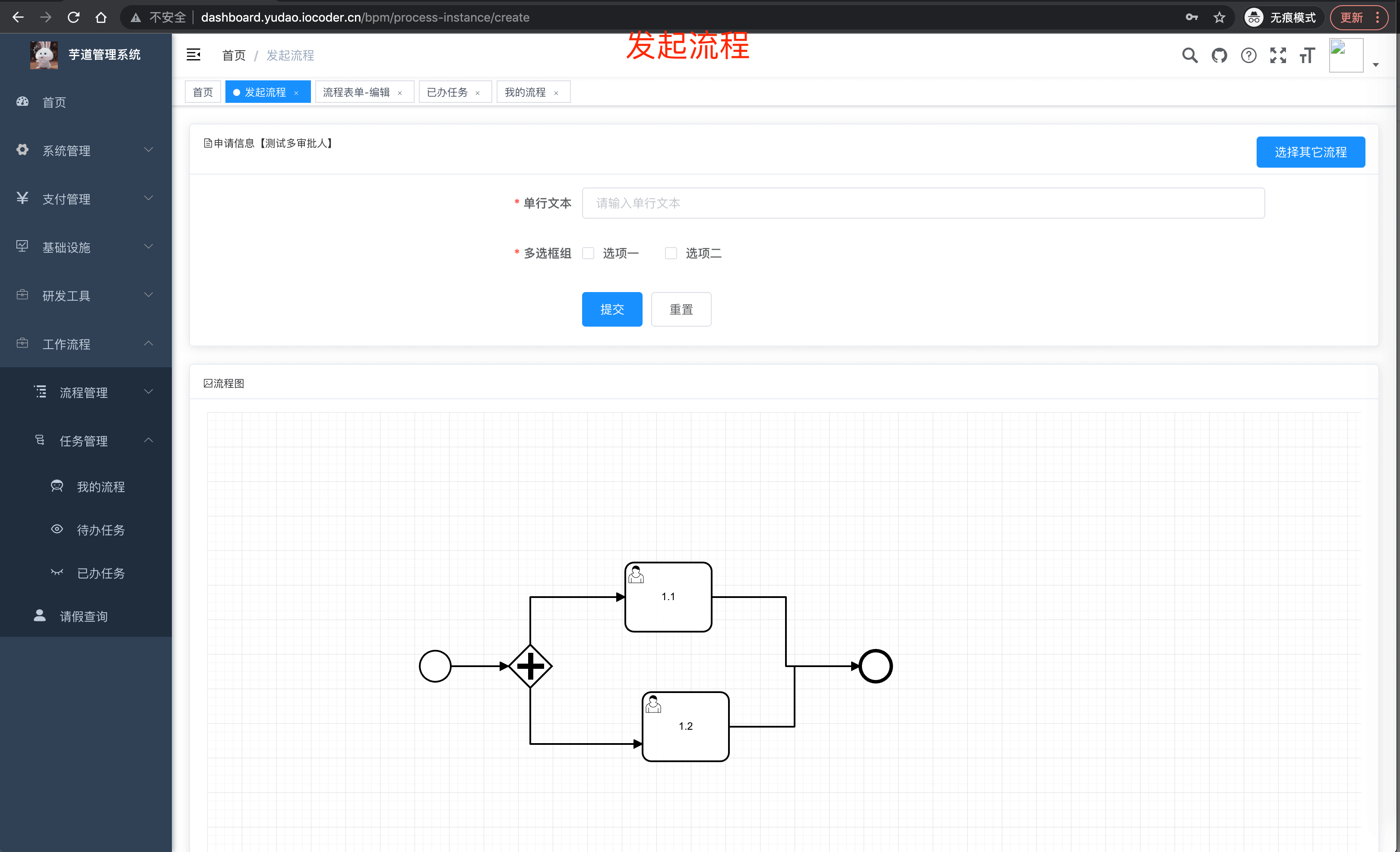 - 工作流使用 Flowable,支持动态表单、在线设计流程、会签 / 或签、多种任务分配方式