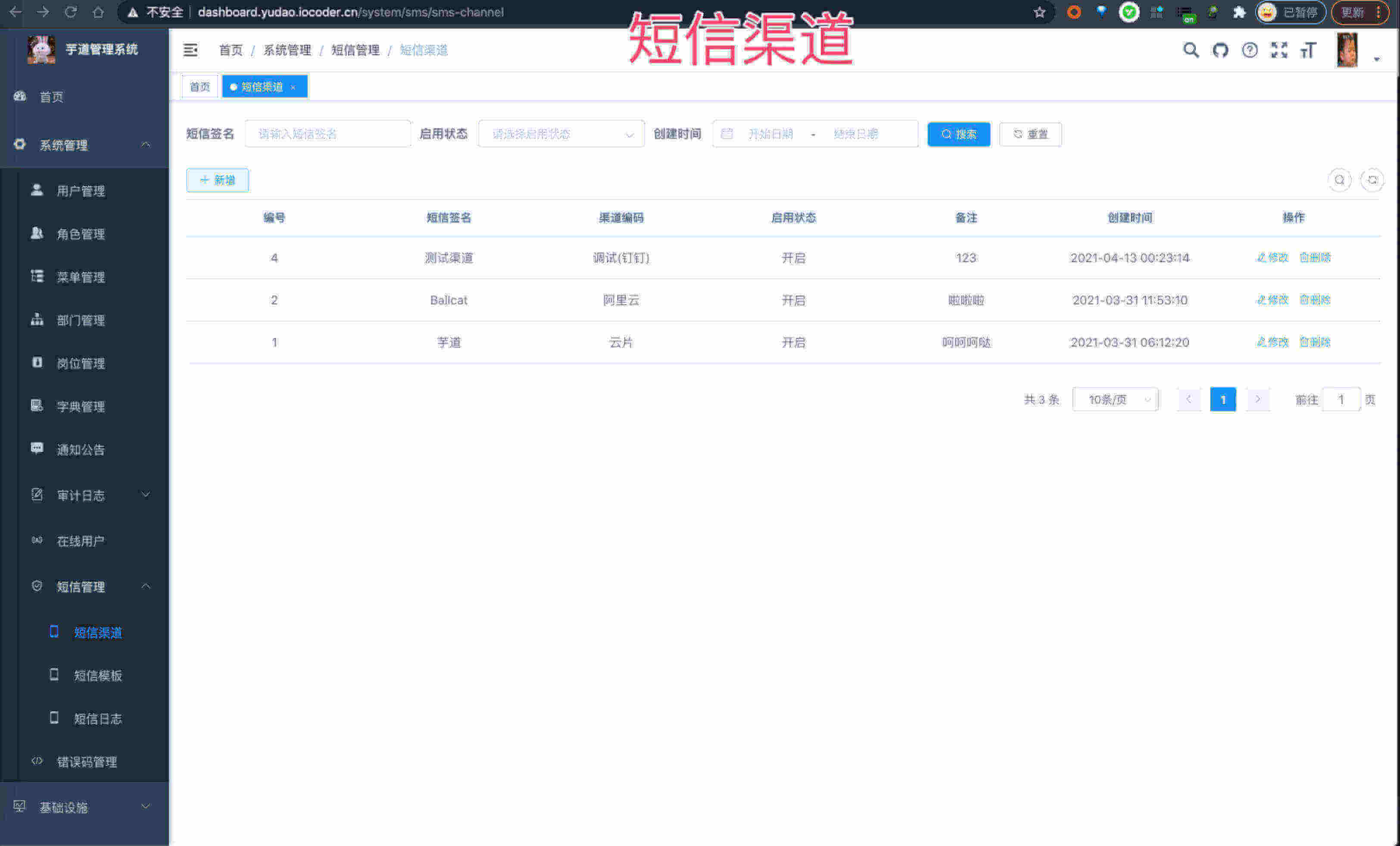 | 🚀 | 短信管理 | 短信渠道、短息模板、短信日志,对接阿里云、腾讯云等主流短信平台 |